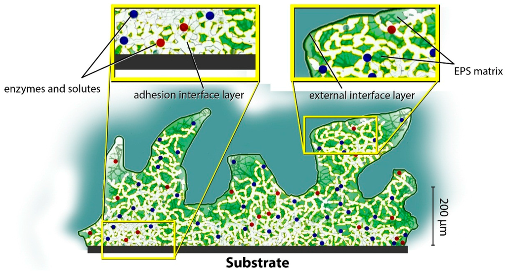 A new approach to provide wide insights in the bio-remodeling process of coastal landforms is based on computational modeling. Biofilm is widely distributed on any type of substrate (even anthropogenic ones) as a fundamental component of the ecosystem, and is well studied and monitored for scientific purposes. Biofilm structure is usually based on different cyanobacteria and diatom communities attached to the bedrock and linked together in a complex gelatinous structure of biochemical compounds, water and ions (with a wide species variability in percentages and composition) known as extra-cellular polymeric substances (EPS) (Figure 11).