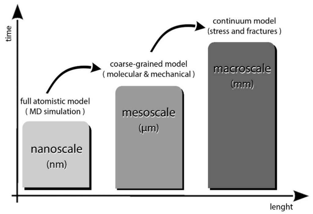 Multiscaling process from molecular dynamics to a continuum theory passing by coarse-grained models for mechanical and dynamical simulations.