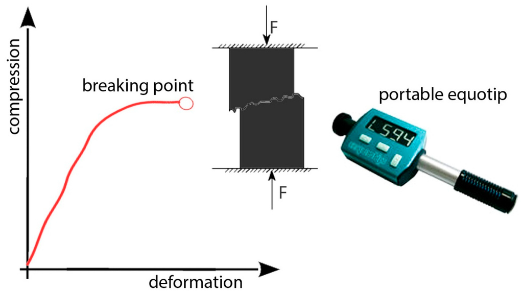 - Viles, H.A.; Goudie, A.S.; Grab, S.; Lalley, J. The use of the Schmidt Hammer and Equotip for rock hardness assessment in geomorphology and heritage science: A comparative analysis. Earth Surf. Process. Landf. 2010, 36, 323–333. [Google Scholar] [CrossRef]