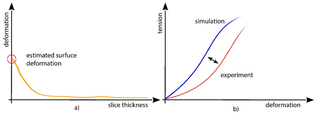 (a) Data interpolation of deformation over slice thickness to estimated surface force penetration and (b) data comparison of measured shear forces with computational model behavior to validate the the procedure. For any slice thickness, 10 obtained values are required to obtain reliable measure of deformation using semi-ex-post analysis and with maximal semi-dispersion for the field of uncertainty.
