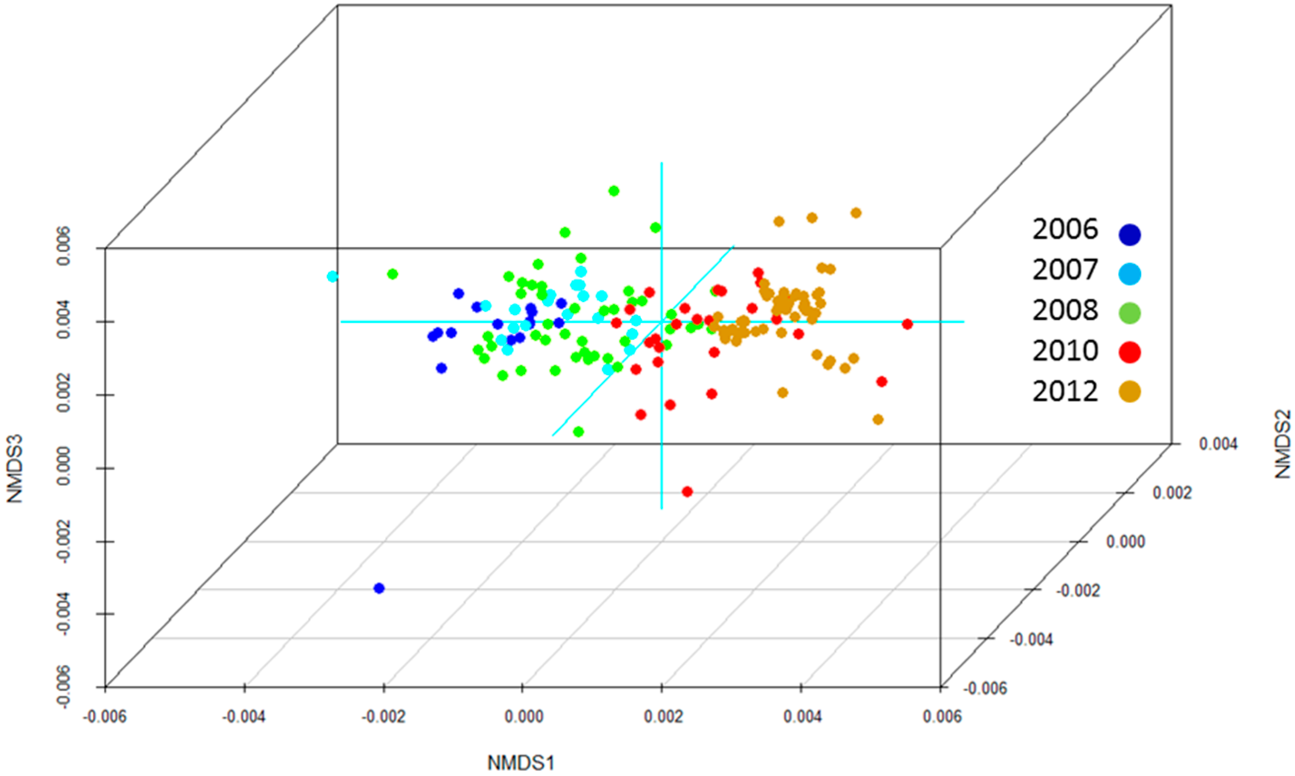 Multivariate, nonparametric, multi-dimensional scaling (NMDS) of gene transcription profiles (see Table 2) of sea otters captured in five different years (2006, 2007, 2008, 2010, 2012) in western Prince William Sound, Alaska, showing distinct separation of 2006–2008 samples from the 2010 and 2012 samples.