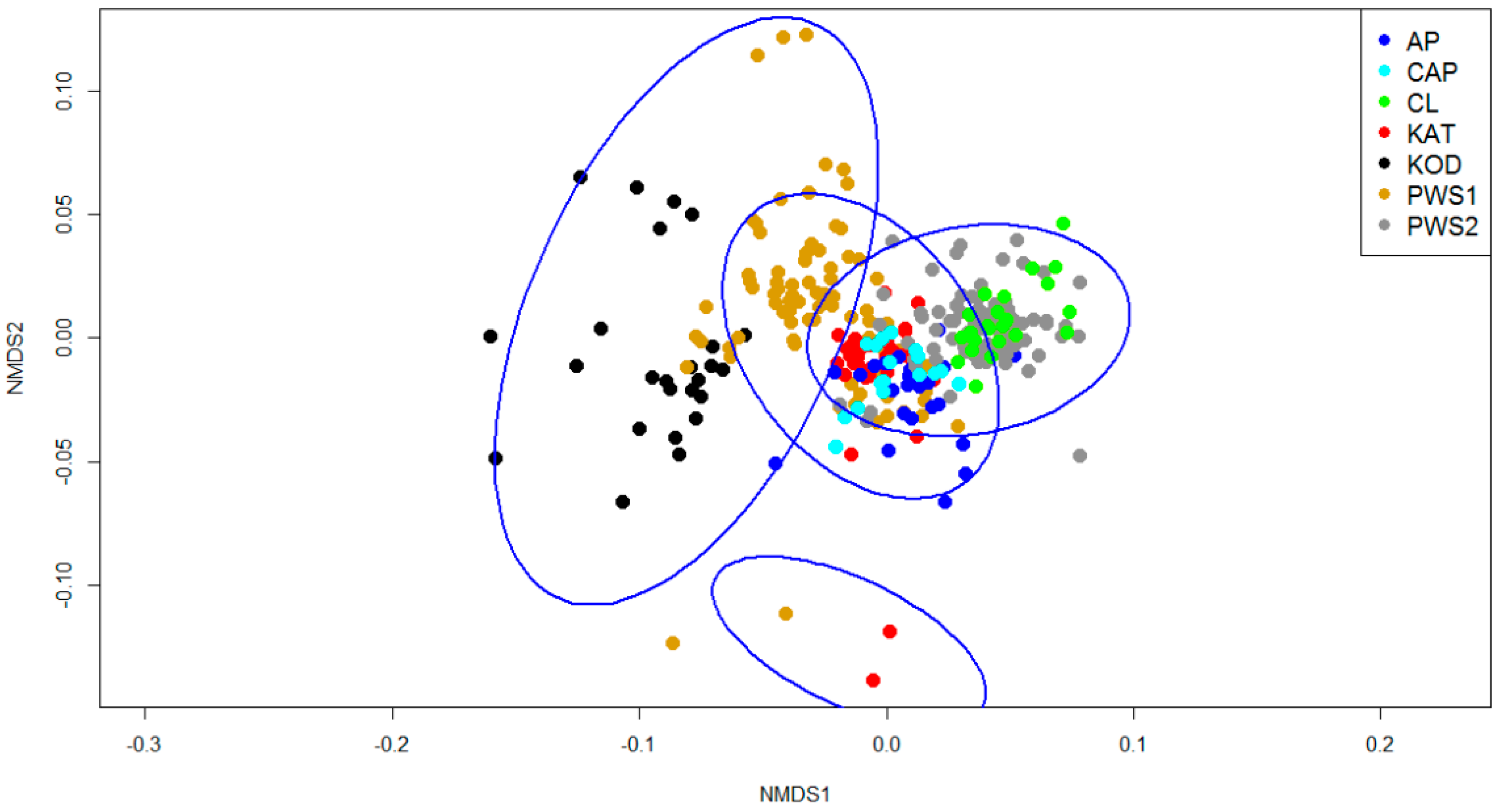 For the analysis of all groups, patterns depicted by the NMDS analyses were similar to those reported in Miles et al. (2012), with differences attributable to the inclusion of the additional groups (Figure 3). Groups generally separated into three distinctive clusters: (1) KOD and PWS1; (2) CL and PWS2; and (3) KAT, AP and captive sea otters (2D R = 0.15; SIMPROF, p < 0.001; Figure 3).
