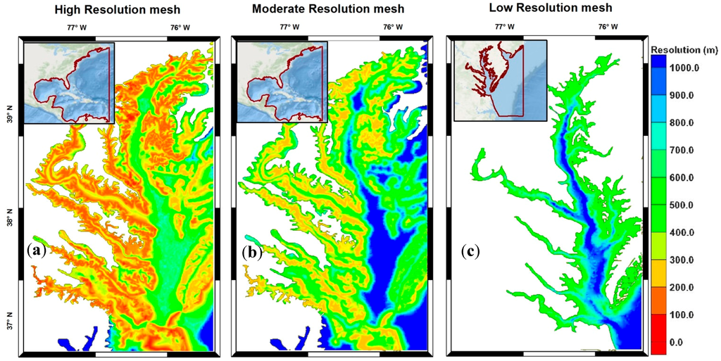 Numerical meshes domain extents and mesh resolution for the Chesapeake Bay region (meters). (a) High resolution; (b) moderate resolution; and (c) low resolution mesh.