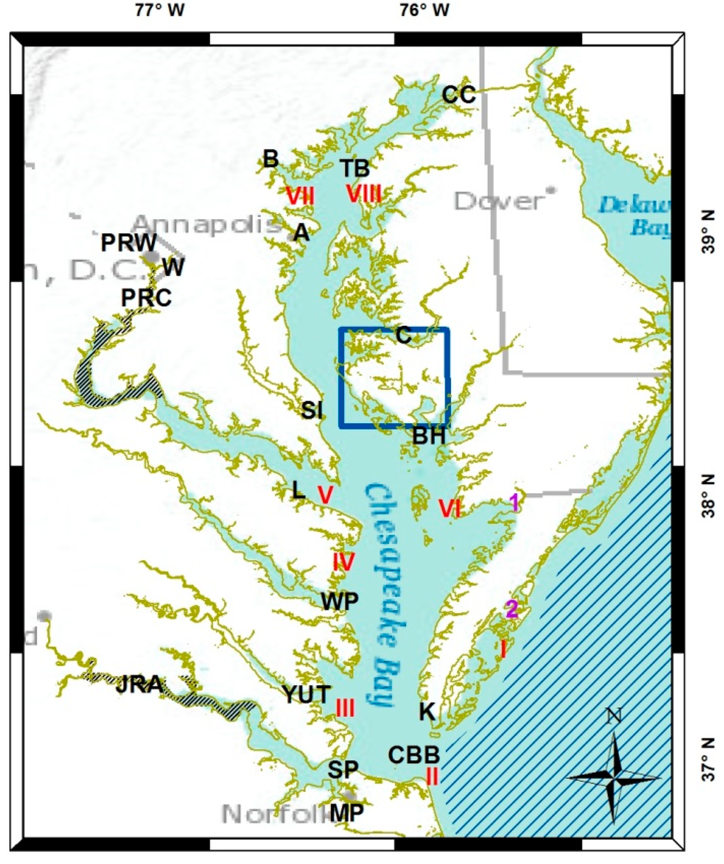 The Chesapeake Bay is the largest estuary of the US, lying between the North American mainland to the west and the Delmarva Peninsula to the east, as it is shown in Figure 1. The bay is approximately 315 km long, and its width varies throughout bay, with 20 km at the mouth of the bay, 45 km near the Potomac River mouth and a few kilometers in the upper bay. The bay main axis entirely runs within Maryland and Virginia, in a north-south direction. The depths are mostly shallow and more than 50% of the system is less than 6.0 m deep. Only 8% of the bay has depths greater than 18.3 m []. The CB has a complex shoreline with more than 50 tributary rivers discharging into the bay, sub-estuaries, as well as wide marsh areas in the eastern side of the bay.