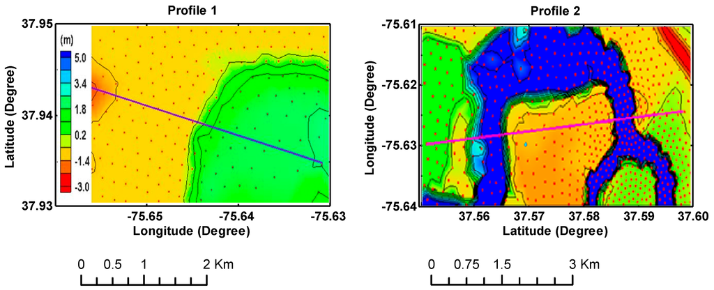 Profile I, is located in the ocean side of Delmarva Peninsula, and II and III in the lower bay. The topography of Profile I consists of a gentle slope (0.6%) until it emerges on a barrier island, and it is separated from the main land by a flood plain. Profile II is located over the mouth of the bay. It has a deeper section, comprising the main channel of the bay, followed by a steeper slope (4%) until reaching the shoreline. Profile III is located inside the bay, and crosses the main channel of the bay, followed by moderate slope until reaching a peak of around 1 meter below the vertical reference (i.e., −1 NADV88). After this peak, a small channel in the onshore side and a gentle beach slope (0.1%) is found.