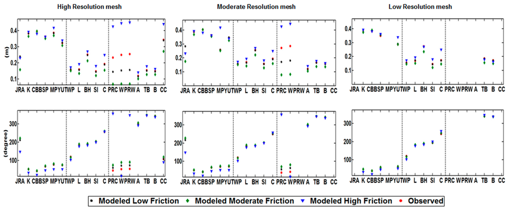 ADCIRC and SWAN simulate processes occurring at different spatial scales, from ocean basins to nearshore or floodplain areas. Therefore, model response to some of physical processes (i.e., surface roughness and interaction of wind waves and circulation) was tested for different levels of resolution. In order to evaluate the influence of numerical mesh resolution on model sensitivity and performance, we will apply three numerical meshes, hereafter defined as: (1) high resolution mesh; (2) moderate resolution mesh; and (3) low resolution mesh. The first mesh used in this study (high resolution mesh) was built and validated by the USACE for the FEMA region III studies []. It has 1.875 million nodes and the minimum mesh resolution is 14 m. The open ocean tidally forced boundary lies on the 60.00° W meridian. The second mesh (moderate resolution mesh) is a modification of the FEMA region III mesh. The moderate resolution mesh has exactly the same domain than the high resolution mesh, but they differ in the number of nodes (this mesh has 0.344 millions of nodes) and in the level of resolution (minimum resolution is approximately 200 m). The third mesh (low resolution mesh) has 0.075 millions of nodes and the minimum resolution is 500 m. Besides a coarser resolution, this mesh presents two fundamentally different features: (a) the open boundary is located closer to the shore, lying on the 74.25° W meridian and the 35.80° N parallel; and (b) land boundaries are used to describe the coastline and intertidal flats are not included on the mesh. The mesh configurations are provided on Table 1. A comparison between the mesh resolutions and computational domains of these meshes are shown in Figure 2. The mesh resolution is computed as the average distance between a node and its neighbors.
