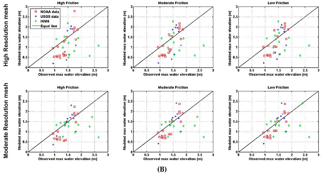 Maximum observed water elevation versus maximum modeled water elevation of Irene (A) and Sandy (B). Upper panels show the simulations performed on the high resolution mesh and lower panels display the simulations performed on the moderate resolution mesh. Left side plots correspond to high friction, middle panel moderate friction and right side low friction.