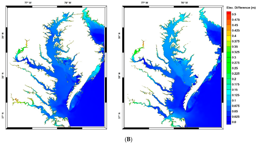 Previous studies and the present work suggest that the election of Manning’s n coefficient between 0.012 and 0.03 in waterway areas might not have a significant impact on the storm surge propagation in the CB. Conversely, a correct selection in some tributaries is vital to properly simulate storm surge. As Kerr et al. (2013) [] suggested, an adequate simulation of tidal physics is important in storm surge model because they contribute to water levels and currents during hurricanes. Therefore, this study supports the idea to use a moderate value of Manning’s n coefficient in James River and a low value in Potomac River. Additionally, these findings demonstrated that a correct selection of the Manning’s n coefficient in overland is essential for model accuracy.