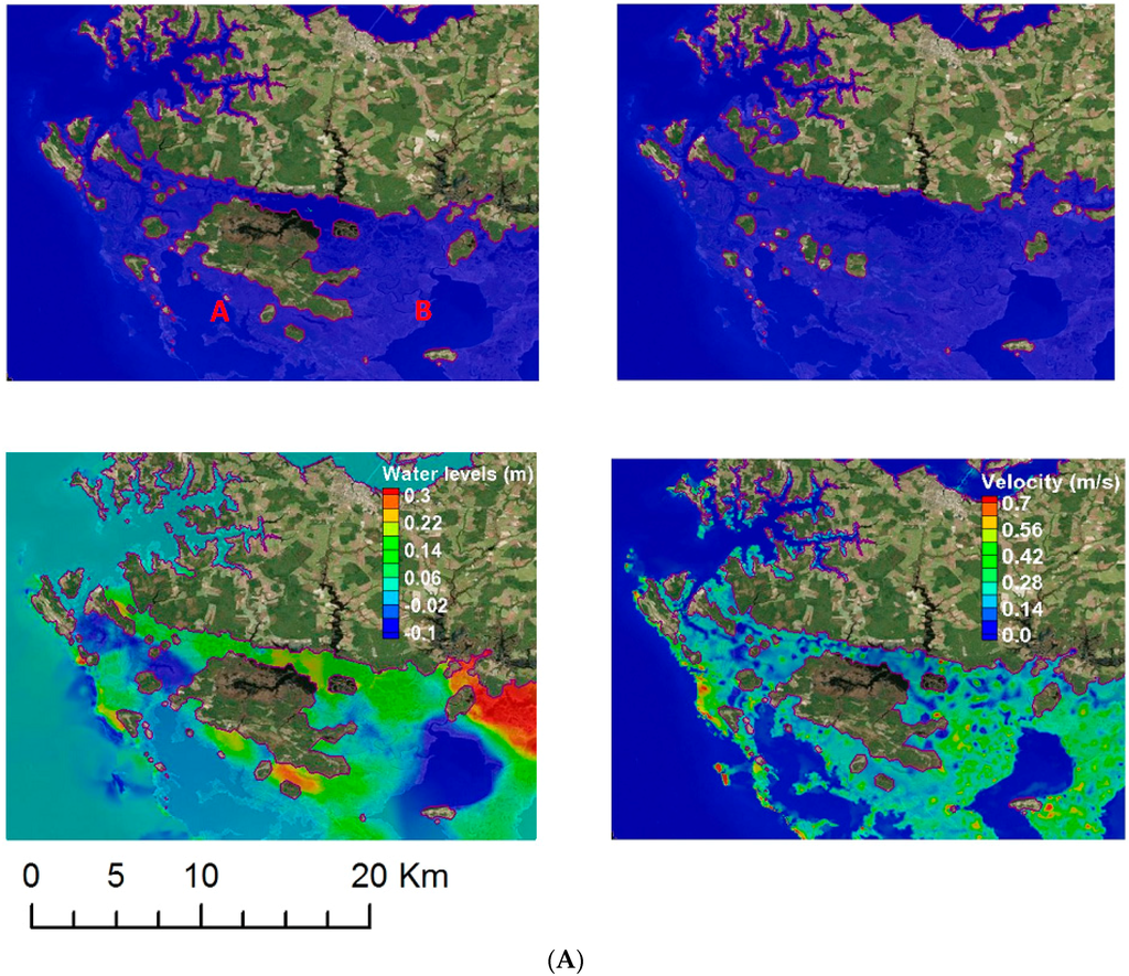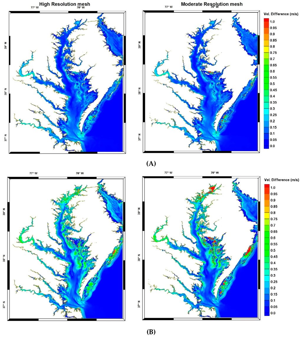 The sensitivity to maximum currents is also shown in Figure 16. Currents along marsh areas of Delmarva Peninsula were also sensitive to ESLM; they were reduced by using a high ESLM up to 0.5 m/s in comparison to the low ESLM. Likewise, velocities at the axis of the shallow rivers or channels were reduced by 0.1–0.3 m/s.