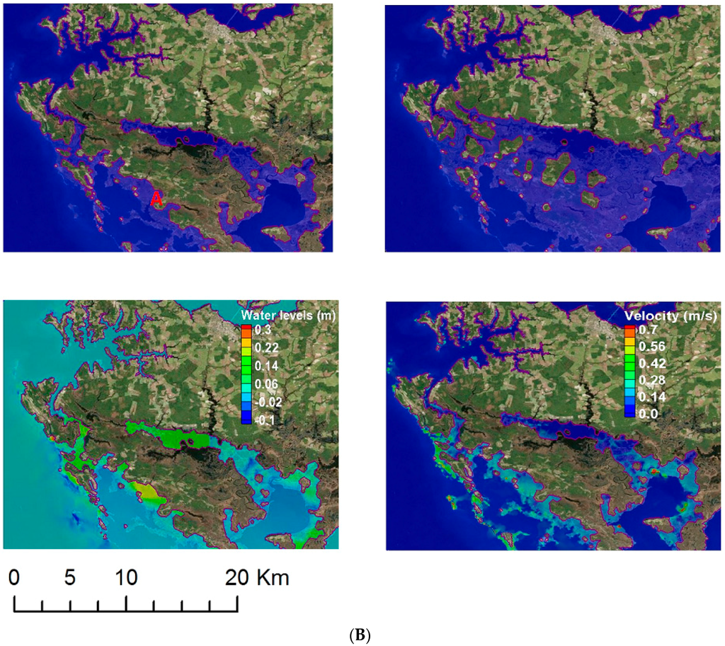 Passeri et al. (2011) [] also affirmed that water levels are more sensitive to Manning’s n coefficient in inland areas. Hurricane Irene and Sandy flood wave characteristics (flood extension, wave propagation, maximum water levels, and maximum currents) in inland areas showed to be clearly sensitivity to bottom friction. Manning’s n coefficient of 0.03 and 0.17 might be associated with pasture or grassland and mixed forest [], therefore, the model is very sensitive to the land cover classification. It might confirm what Ferreira et al. (2014) [] demonstrated, and an incorrect land cover choice may lead to error in surge of 7.0%. Resio and Westerink (2008) [] discussed that an increased frictional resistance slows the rate the flood wave moves inland. It could increase water levels in portions of the system, and attenuates the surge amplitude. These processes were observed on Figure 11A.