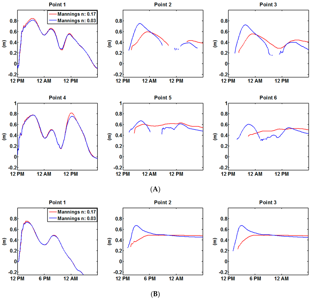 Figure 11A shows water levels time series during Hurricane Irene at three stations along Transect A and B displayed in Figure 10. Points 1 and 4 are found in open water, Points 2 and 5 closely to the shoreline, and Points 3 and 6 are located further inland. These points were spaced between 100 m and 200 m along the each transect. Water levels simulated by the low and high Manning’s n coefficients runs at Points 1 and 4 exhibited slight differences, but it is noteworthy to point out that they were at wet locations. As it was seen in Figure 10A, a higher friction on inland areas increased water levels in wet areas by the shoreline. Point 2 and 3 showed the model is highly sensitive to Manning’s n coefficient. A lower friction resulted in a higher peak of the water levels (0.15 m) and, also this peak was reached about 4–5 h earlier. Point 3 presented a similar behavior, but additionally a higher friction obstructed the receding of the flood wave increasing the flood depth during the low tide.