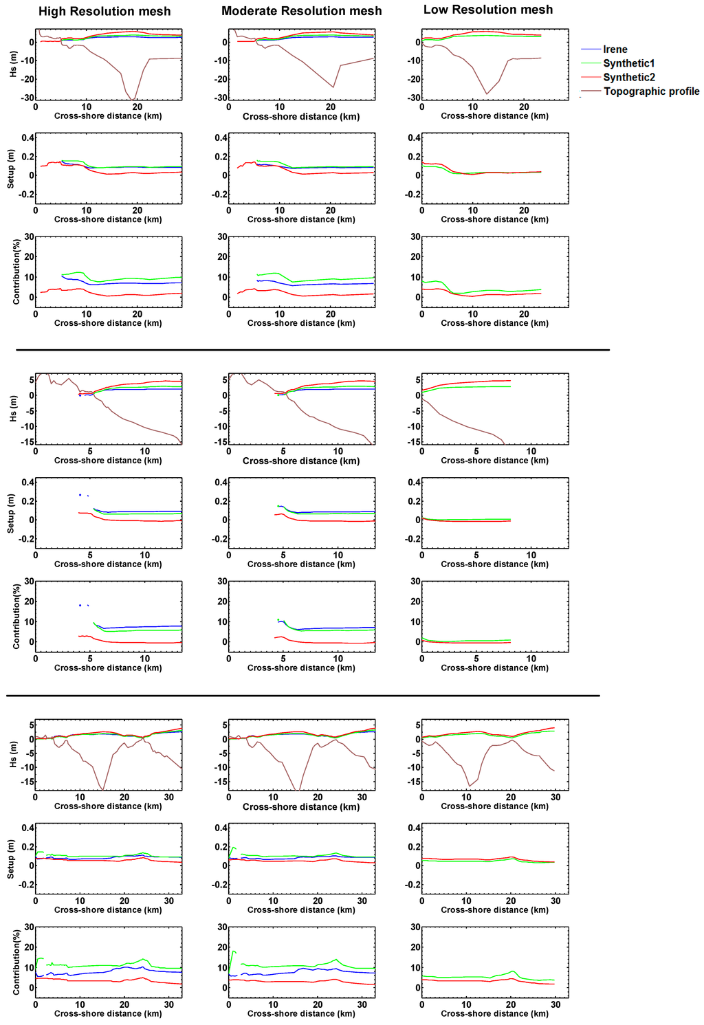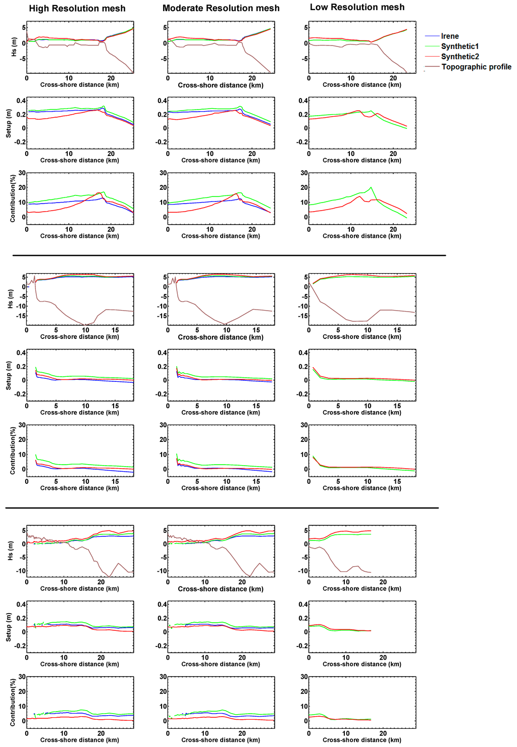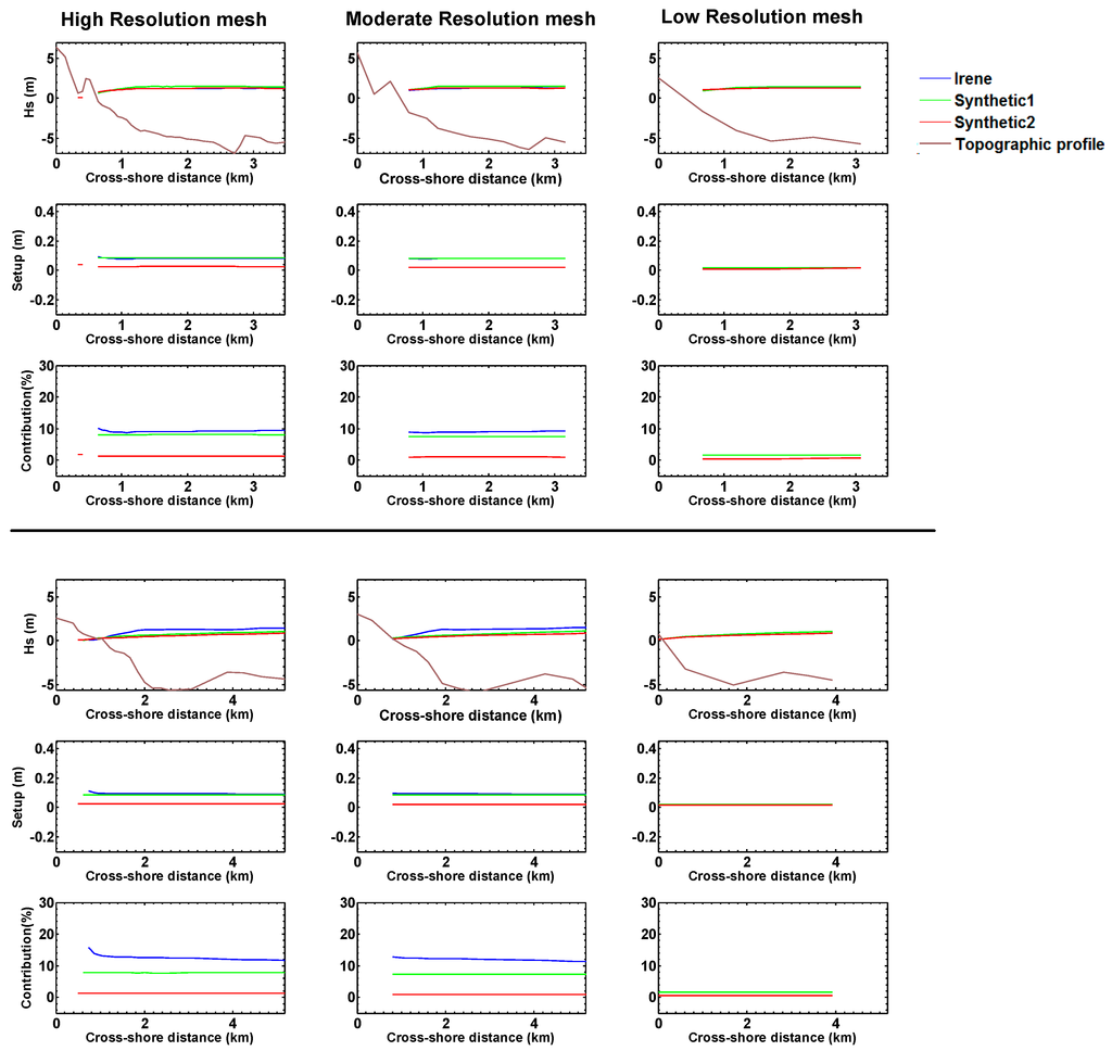 Water levels driven by Hurricane Irene, Synthetic storm 1, and Synthetic storm 2 were simulated by using ADCIRC and the couple version (ADCIRC + SWAN) to study the wave radiation stress gradients contribution to overall water levels. Further, these simulations were performed on the three numerical meshes. Hs during the peak of the storm, wave setup, and relative contribution (i.e., the contribution of wave setup to overall water levels in terms or percentage) along eight profiles shown previously in Figure 5 were analyzed.