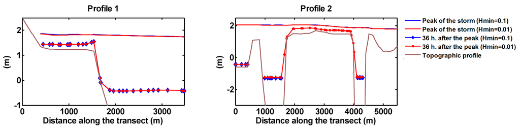 Water levels during the peak of the storm (solid line) and 36 h after the peak (dash dot line) along Profile 1 and 2. Red lines represent Hmin or H0 equal to 0.01 and blue lines H0 equal to 0.1.
