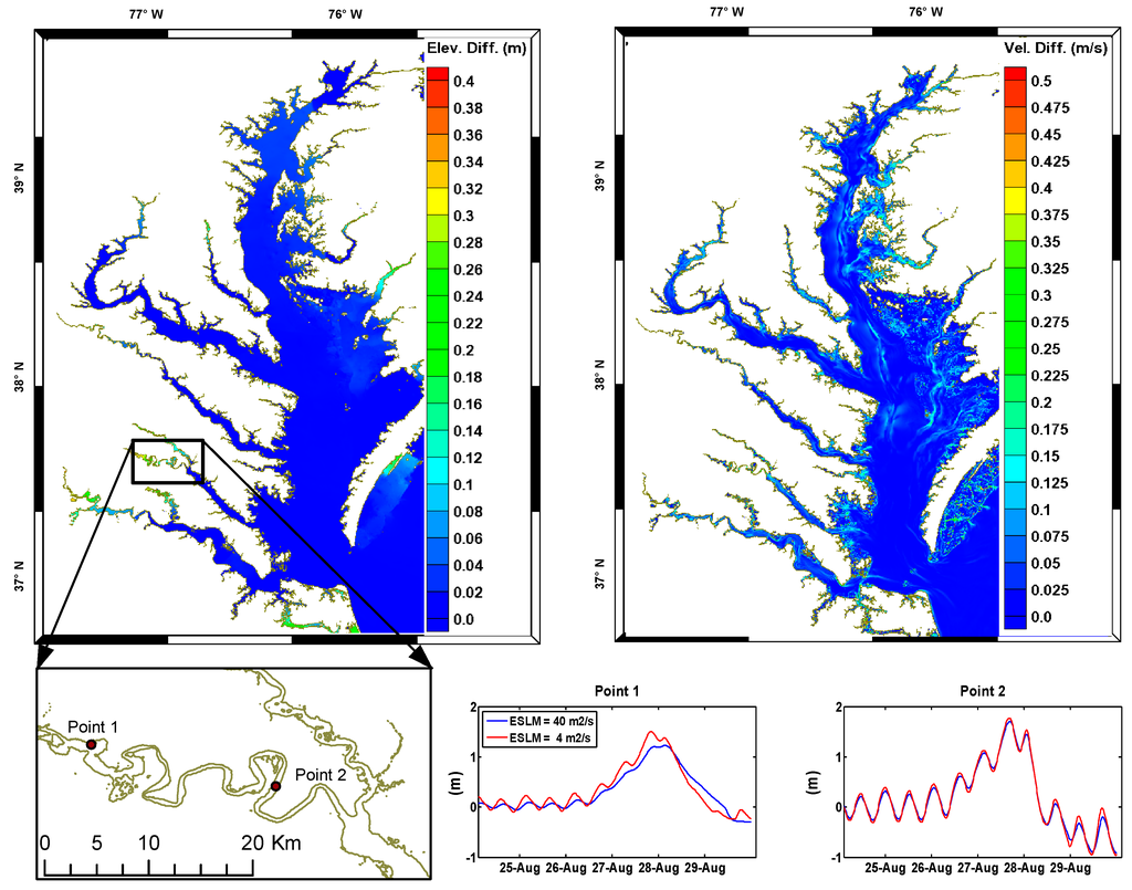 Hurricane Irene was hindcasted by a using ESLM equal to 4 and 40 on the high resolution mesh. Figure 16 shows the difference in maximum water elevation and maximum velocities for the high and low ESLM simulations. The simulated peak of the water surface elevation was not sensible to the ESLM variation in open water and in the small tributaries. By contrast, ESLM had a significant impact at the upper stream side of the longer tributaries, especially those tributaries in which their morphology exhibits a very narrow and meandering channel. This phenomenon was very noticeable on the two major tributaries at the lower bay and maximum differences up to 0.40 m were observed. The bottom panels of Figure 16 displays time series of water levels for two points in one of those tributaries. Water levels at Point 1 was highly sensitive to ESLM, even before the storm reached the area, the tidal signal produced by the high ESLM run was dampened with respect to the low ESLM run; the tidal amplitude was reduced by the half, 0.15 m, using a high ESLM value. In the same way, the peak of the storm decreased in 0.30 m. Point 2 was less sensitive, although a reduction of the tidal amplitude of 0.12 m. was found. The peak of the storm similarly decreased in 0.07 m. by using a high ESLM. Accordingly, these topographic details dissipated a large amount of energy, reducing significantly the amplitude of the tidal wave, (from 0.70 m at point 2 to 0.35 m at point 1), and this effect is amplified by using a high ESLM, (from 0.57 m to 0.17 m.).