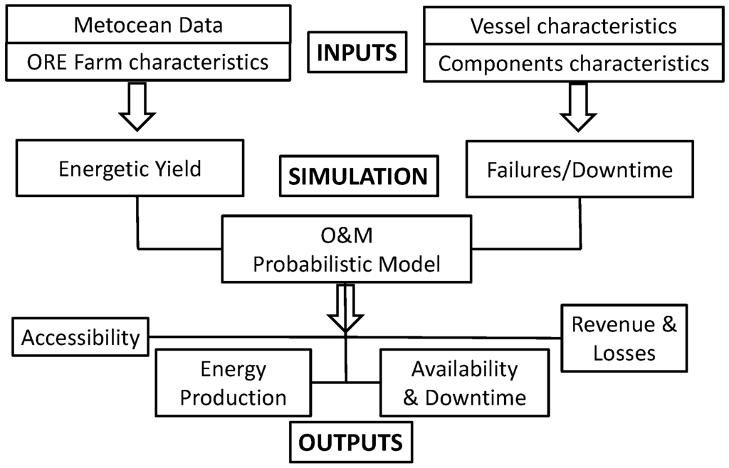 During recent decades, the quest for alternative forms of producing energy has included the double aim of satisfying the increasing energy demand and lowering the pollutant emissions on the environment. Renewable energies seem to satisfy both these requirements and are becoming progressively more important in the global energy mix. Among them, wave energy, could play an important role in the future electricity supply from renewable sources [1]. However, due to the high costs related to the deployment of wave energy devices, the cost of energy (CoE) associated to wave power is still too high to be competitive with that of conventional fossil fuel power plants. On one hand, the technology still needs to be improved; producing enhanced devices, capable of harvesting more of the energy contained in the waves and with a better chance of surviving in extreme conditions, is pivotal [1,2]. On the other hand, improvements in the reliability and availability of the devices, as well as advances in their operation and maintenance (O&M) are required. Both these enhancements aim to increase the productivity and reduce the running costs of wave energy converters (WECs) which, in turn, will lead to an increase in their competitiveness in the electricity market [3,4]. To achieve this goal, among other tools, a number of computational models have been created in the last few years to simulate the lifecycle logistics of an offshore farm and assess performance.