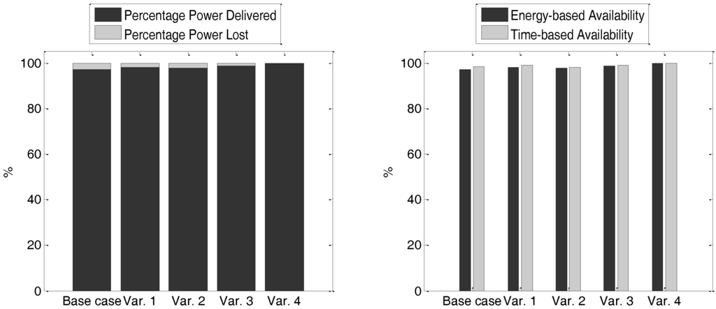 As can be seen in Table 3, all the variations proposed in this work have the intended effect of increasing the productivity of the farm, except for Variation 2 which consisted in the creation of a scheduled maintenance plan. This can be further visualized in Figure 3, where the percentages of power delivered and lost with respect to the ideal production on one side, and the energy-based and time-based availability on the other side, are graphically analyzed for the different scenarios. In comparing the relative increase in production of Variation 2 with respect to the base case, even though it is positive, it must be remembered that the choice of a different vessel made in Variation 1 had been kept, therefore there actually is a decrease in relative production. As mentioned earlier, this is due to the choice of exponential failure distributions and a possible overemphasis on preventive undertakings; use of variable distributions and less conservative maintenance strategies may be considered for further optimization.