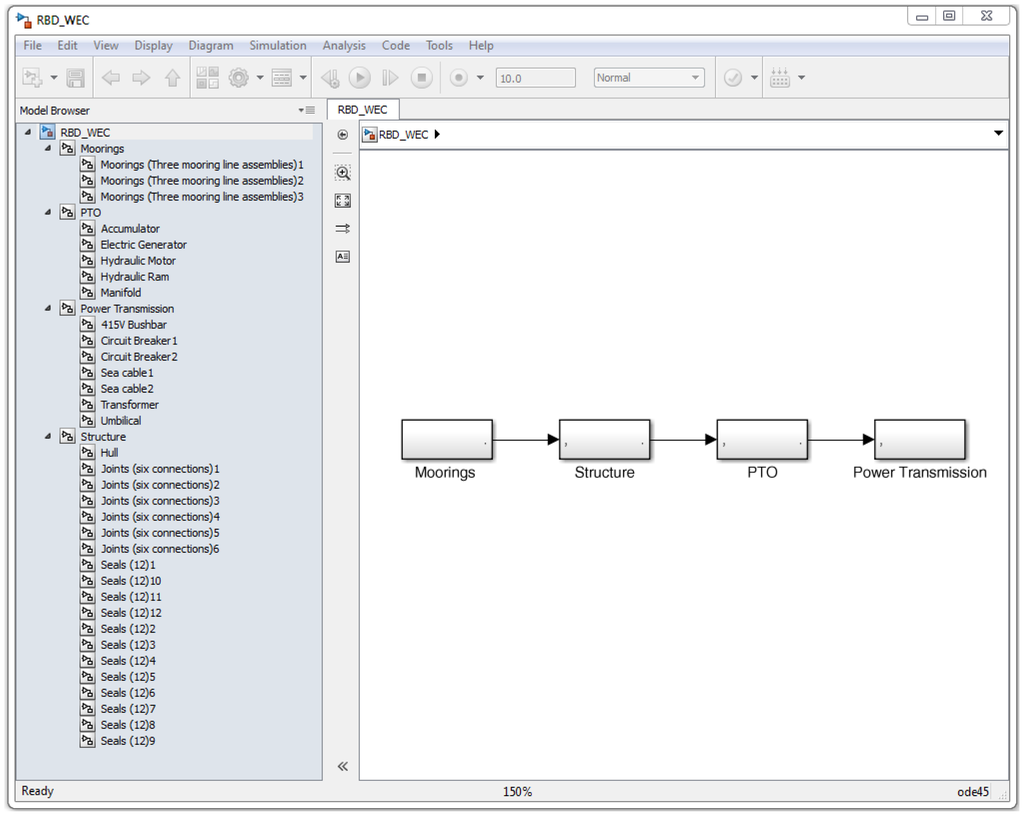 Furthermore, details on the reliability structure of the devices are needed to simulate the operation of the farm. These specifics include information on the taxonomy of the device, i.e., its composition in terms of systems, subsystems and single components, and related information for the repair processes. A Reliability Block Diagram (RBD) [12] of the device is automatically created to visualize the results of the implementation. For each component, the failure rate (in failures/hour) has to be specified together with its failure distribution (Weibull or exponential), eventual adjustment factors due to external loads, maintenance and fault categories, procurement and repair time, eventual redundancies and cost of the spare parts. All this information is used to simulate eventual failures and consequent downtimes of the devices, as well as effects on the economic valuation. Inputs in terms of maintenance vessels’ capabilities are then used to simulate the repair or replacement processes and bring back the devices to their operating state. Times related to the return to operational conditions are established through the proprietary offshore operations planning software Mermaid (http://mojomermaid.com/). Eventual preventive maintenance operations can be scheduled and taken into account by the model in order to reset the failure distribution of the components.