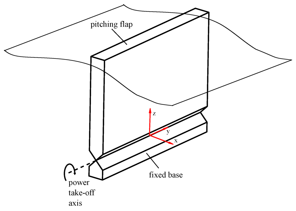 The oscillating wave surge converter is modelled on Oyster™(Aquamarine Power, Edinburgh, Scotland), as shown in Figure 2. The flap, driven by excitation forces from the waves that predominantly travel in the positive x direction, oscillates about a pivot aligned with the y axis as shown in Figure 2. A power take-off in the pivot joint extracts energy from the rotation of the flap relative to the fixed base. The flap’s physical properties are given by Table 4 identical to the OWSC studied by Hoff [18]. In this work, the flap is situated in a water depth of 25 m. The pivot is set to 8.9 m below the still water level and the top of the flap is coincident with the still water level.