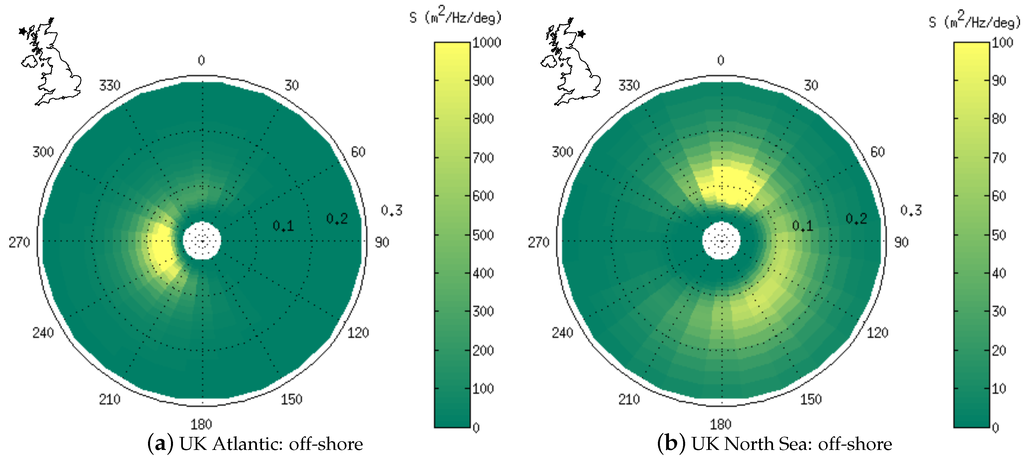 To illustrate the typical direction-frequency distribution of wave energy, the average wave spectrum was calculated for all four UK sites. Figure 5 shows the average spectra at the UK Atlantic and North Sea off-shore sites.