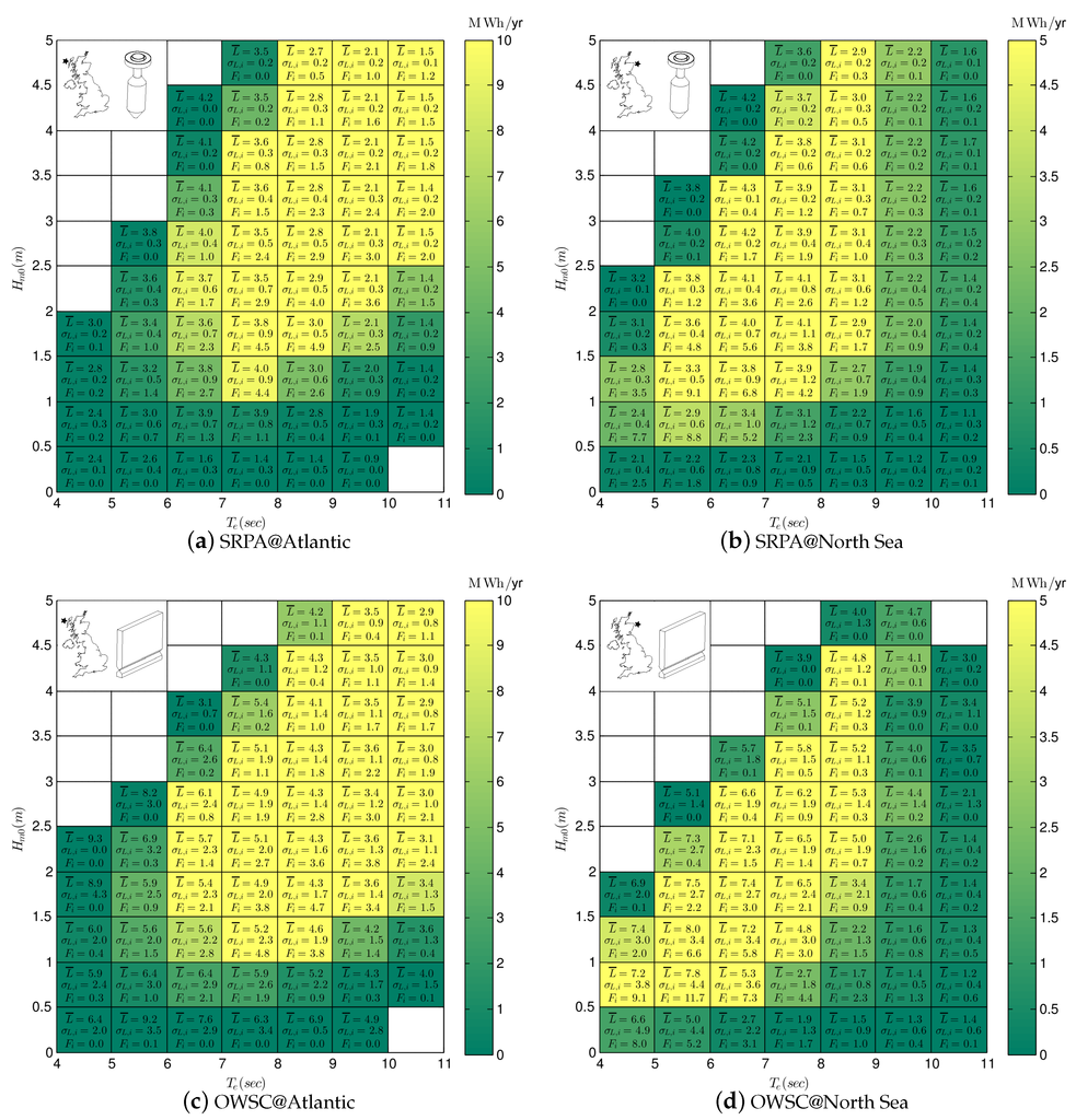 Wave matrices for UK offshore sites. Text indicates mean and standard deviation of wave power (, , in kW/m) and frequency of occurrence ( as a percentage). Color indicates average wave energy in MWhr/yr/m.