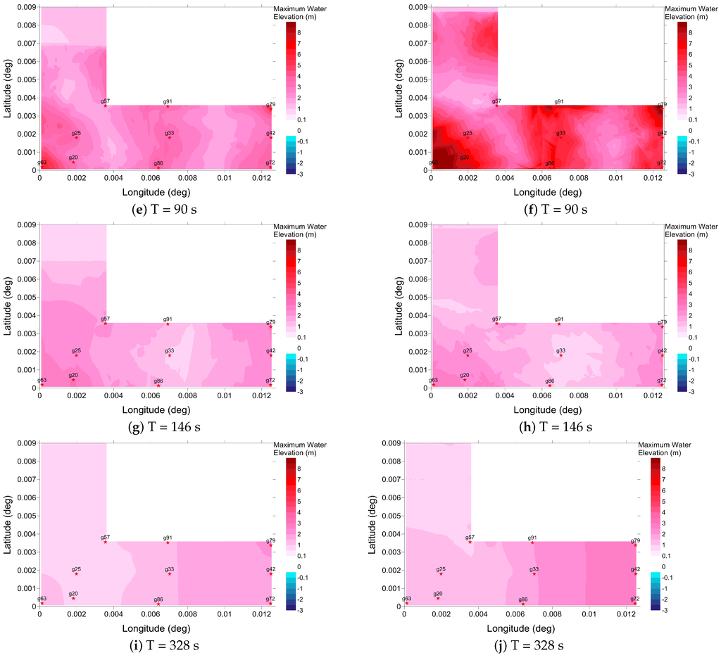 The spatial distribution of the maximum water surface elevation (m) computed by the simulation of the sinusoidal line crest long wave with a 1-m wave amplitude with T = 16 s, T = 46 s, T = 90 s, T = 146 s, T = 328 s for LA/LB = 0.8 in the left column and LA/LB = 1 in the right column.