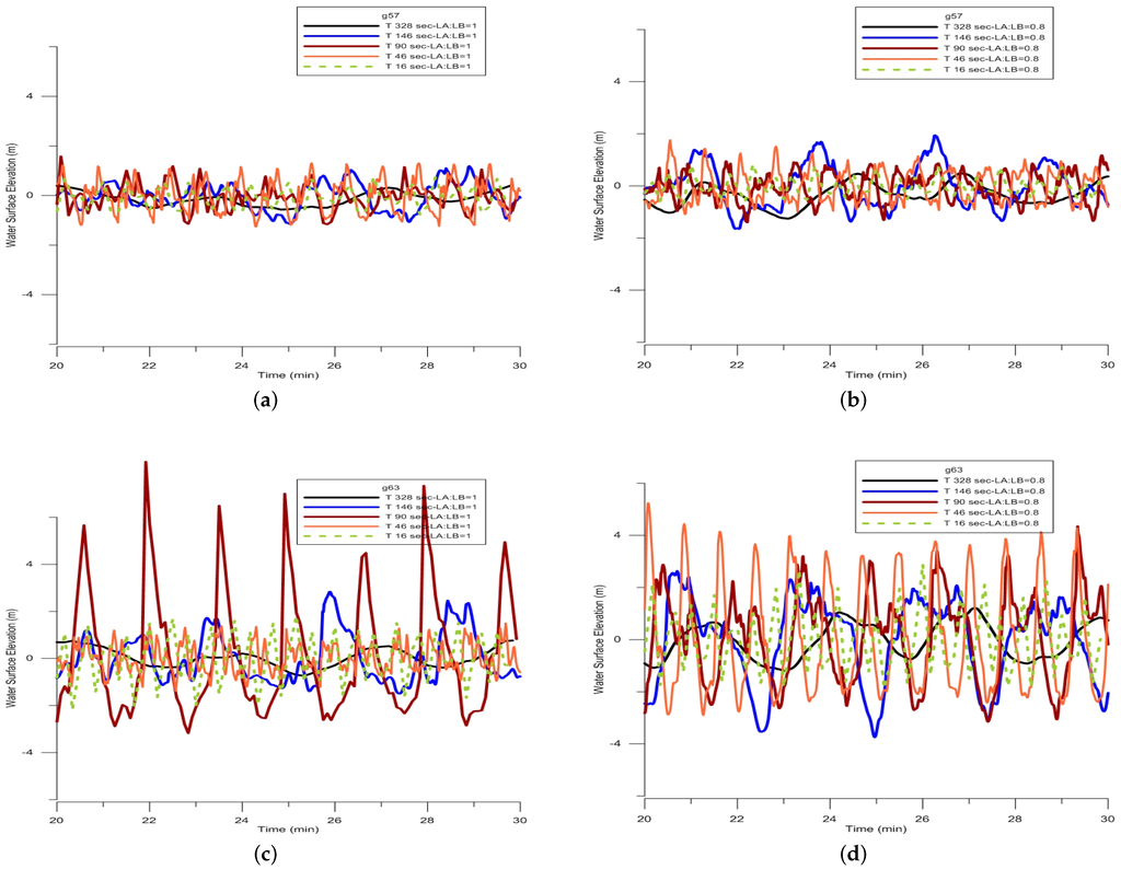 Time history of water surface elevation computed by the simulation of the sinusoidal line crest long wave with a 1-m wave amplitude with T = 16 s, T = 46 s, T = 90 s, T = 146 s, T = 328 s for LA/LB = 1 (left column), for LA/LB = 0.8 (right column) in Gauge 57 (a,b) and Gauge 63 (c,d).