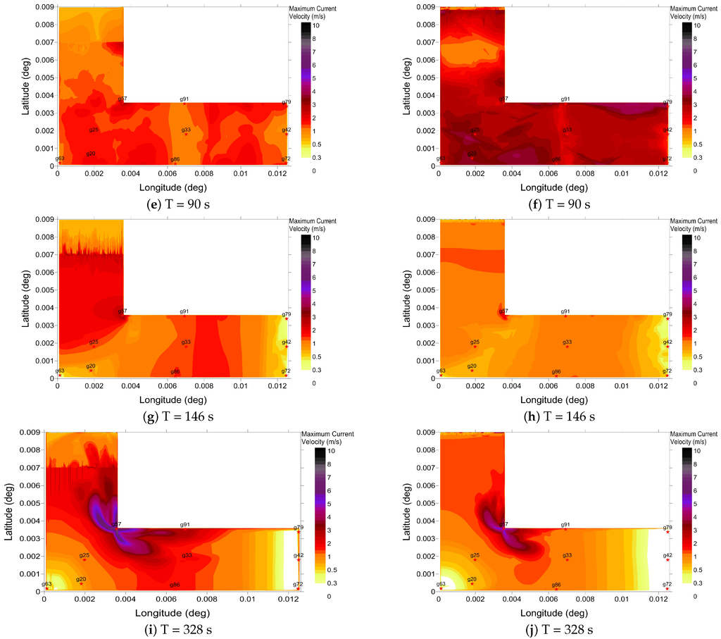 The spatial distribution of the maximum current velocity (m/s) computed by the simulation of the sinusoidal line crest long wave with a 1-m wave amplitude with T = 16 s, T = 46 s, T = 90 s, T = 146 s, T = 328 s for LA/LB = 0.8 in the left column and LA/LB = 1 in the right column (a–j).