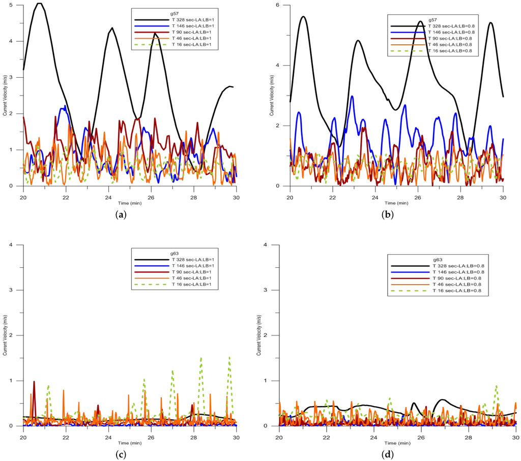 Time history of the current velocity computed by the simulation of the sinusoidal line crest long wave with a 1-m wave amplitude with T = 16 s, T = 46 s, T = 90 s, T = 146 s, T = 328 s for LA/LB = 1 (left column), for LA/LB = 0.8 (right column) in Gauge 57 (a,b) and Gauge 63 (c,d).