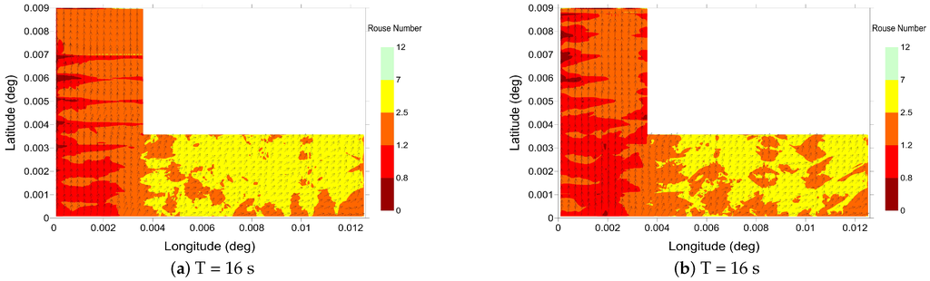 The minimum Rouse number distribution, as well as the maximum velocity vectors are shown in Figure 6. According to the range of the Rouse number values, the sediment motion in the exterior corner (Gauge 63) is in bed load mode for larger wave periods (T 146 s and 328 s). In the end side of the basin, sediments move in the form of bed load in larger wave periods, as well. This indicates that these areas in the basin have high potential to be exposed by the material deposition.