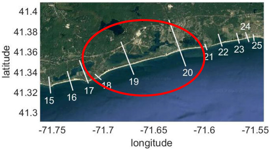 Location of the Federal Emergency Management Agency (FEMA) (2012) [2] Washington County, RI Wave Height Analysis for Flood Insurance Studies (WHAFIS) transects in the vicinity of the study area. The Charlestown study area is shown in the red circle. The FEMA transects of primary interest are numbers 19 (west) and 20 (east).