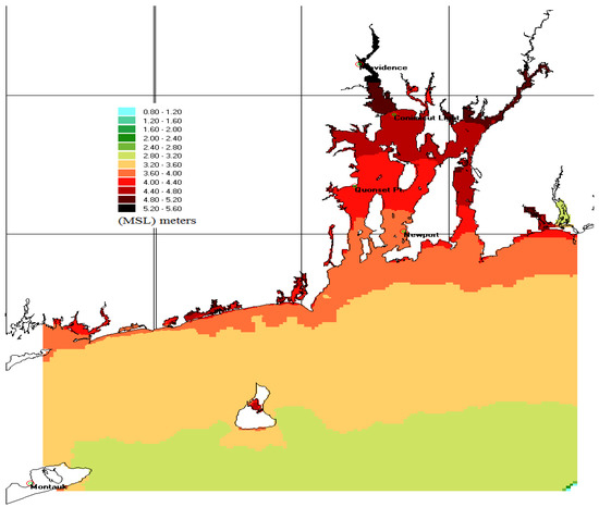 - Spaulding, M.L.; Isaji, T.; Damon, C.; Fugate, G. Application of STORMTOOLS’s simplified flood inundation model, with and without sea level rise, to RI coastal waters. In Proceedings of the ASCE Solutions to Coastal Disasters Conference, Boston, MA, USA, 9–11 September 2015.