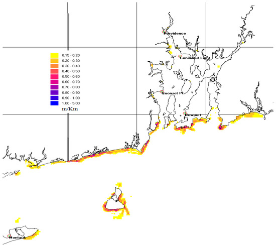 Contour map of the slope of water level (m/km) for NACCS 100 year, upper 95% surge plus tide case.
