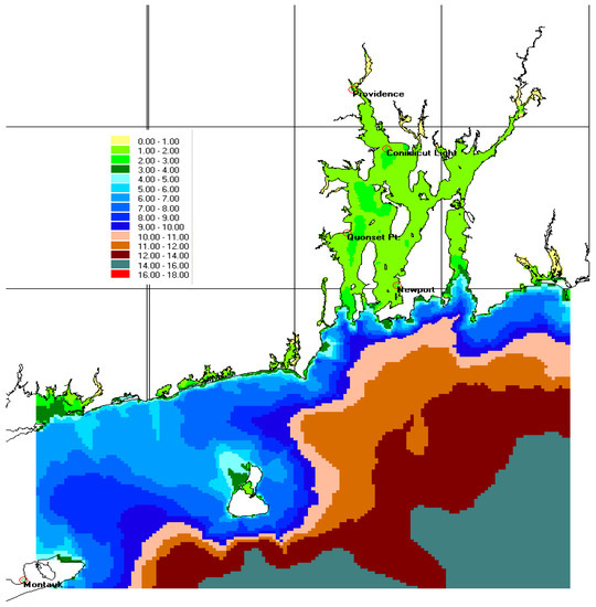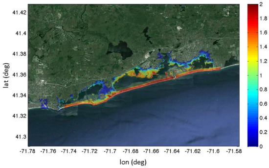 The STWAVE model is a phase-average, steady state, spectral wave model and simulates depth-induced wave refraction and shoaling, current induced refraction and shoaling, depth and steepness-induced wave breaking, wind-wave growth, and wave-wave interaction and white-capping, that redistributes and dissipates energy in a growing wave field. The model does not include wave run-up as this is a time-dependent process. The dune that is present along the barrier system is assumed to be eroded based on Oakley’s (2016) [13] analysis of a long-term (>30 years) time series of cross-shore beach profiles for the study area. Frictional losses from overland flows are addressed by assigning Manning roughness coefficients to each grid and depend on land cover and vegetation type. The land use was translated into Manning roughness based on standard hydraulic literature [14], as implemented by Wamsley et al. [15], resulting in a Manning coefficient map with variations from 0.02 in open water to 0.1 over woody wetlands. Manning roughness was specified based on a 30 m resolution map of ground cover provided by RI Geographic Information System (RIGIS) [16]. Table A1 provides the Manning coefficients by land type and use. Figure A1 shows its spatial distribution for the coastal area along the southern RI shoreline.