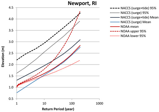 To assess the performance of the NACCS model predictions for the study area, the model predicted water levels vs. return period were compared with data from the closest NOAA NOS water level station at Newport, RI (Station ID #8452660) [18]. This is the water level station closest to the Charlestown study area.
