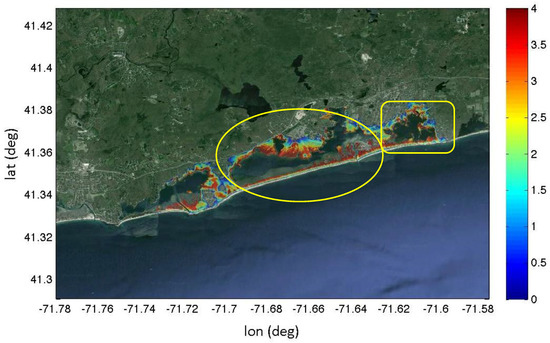 Inundation depths (m) relative to grade for Charlestown, RI for 100 year event [20]. Ninigret Pond is shown in the yellow oval and Green Hill Pond in the yellow box. The contour scale provided at the right of the figure is in meters.