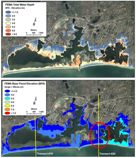 FEMA predicted total water depth (m) measured from grade to Base Flood Elevation (BFE) (upper panel) and BFE (m) relative to NAVD88 (lower panel). FEMA transect lines are shown in yellow, #19 (left) and #20 (right). Area of substantial increase in BFE near the shoreline from one side of transect #20 to the other (red circle).