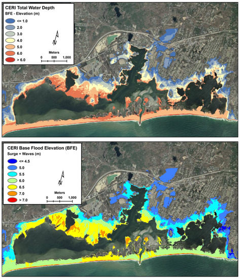 NAST/URI (CERI—Coastal Environmental Risk Index) predicted total water depth (m) measured from grade to BFE (upper panel) and BFE (m) relative to NAVD88 (lower panel).