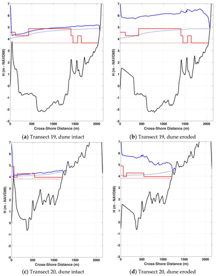 To provide a more in-depth comparison between the results of FEMA and the current study (NAST), Figure 14 shows the predicted SWEL and BFEs vs. distance landward for transects #19 (upper panel, a and b) and #20 (lower panel, c and d). The location of the transects are shown in Figure 12 (lower panel). The length of transect #19, over the flooded area (2100 m), is about twice that of transect #20 (1200 m). Analyses were performed for the dune intact (left side, a, c) and dune eroded (right side, b, d) conditions. The FEMA dune erosion protocol was used by FEMA to generate their results, while the current study used observation based estimates of the eroded dune profile, as described earlier [13]. The FEMA erosion model assumes that a dune with a volume less than 540 square feet per foot of shoreline above the SWEL are eroded [1]. No dunes in the study area exceed this volume for either of the SWEL’s (3.7 m or 4.1 m). The FEMA erosion model projects erosion from the toe of the dune, landward at a slope of 1:50 [22,23]. This does not match the observations in the study area for previous storm events. FEMA did not provide a dune intact case; hence the eroded dune case is shown. The topography is shown in black and based on the current DEM for the study area. The eroded dune profile shown in the figure is based on the present study approach. The plain bold blue line shows the NAST simulated total water elevation (Base Flood Elevation, BFE), and the light blue, dashed line shows the predicted still water elevation level (SWEL, combination of astronomical tide, storm surge, and static wave setup). For comparison, FEMA’s inundation zones are shown in red, with the BFE shown in bold plain, and the SWEL in dashed, light red. The FEMA results are taken directly from the Washington County FIS [2]. Attempts were made to reproduce the WHAFIS predictions for these two transects but without success. Unfortunately, FEMA was unable to reproduce the results shown for each of these transects.
