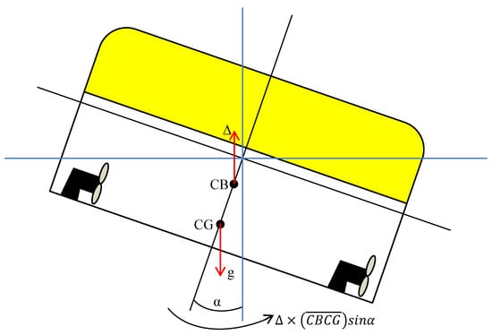 Righting moment of stable ROV. The righting moment is a function of the buoyancy force, distance between centre of buoyancy (CB) and centre of gravity (CG), angle from upright position and gravity.