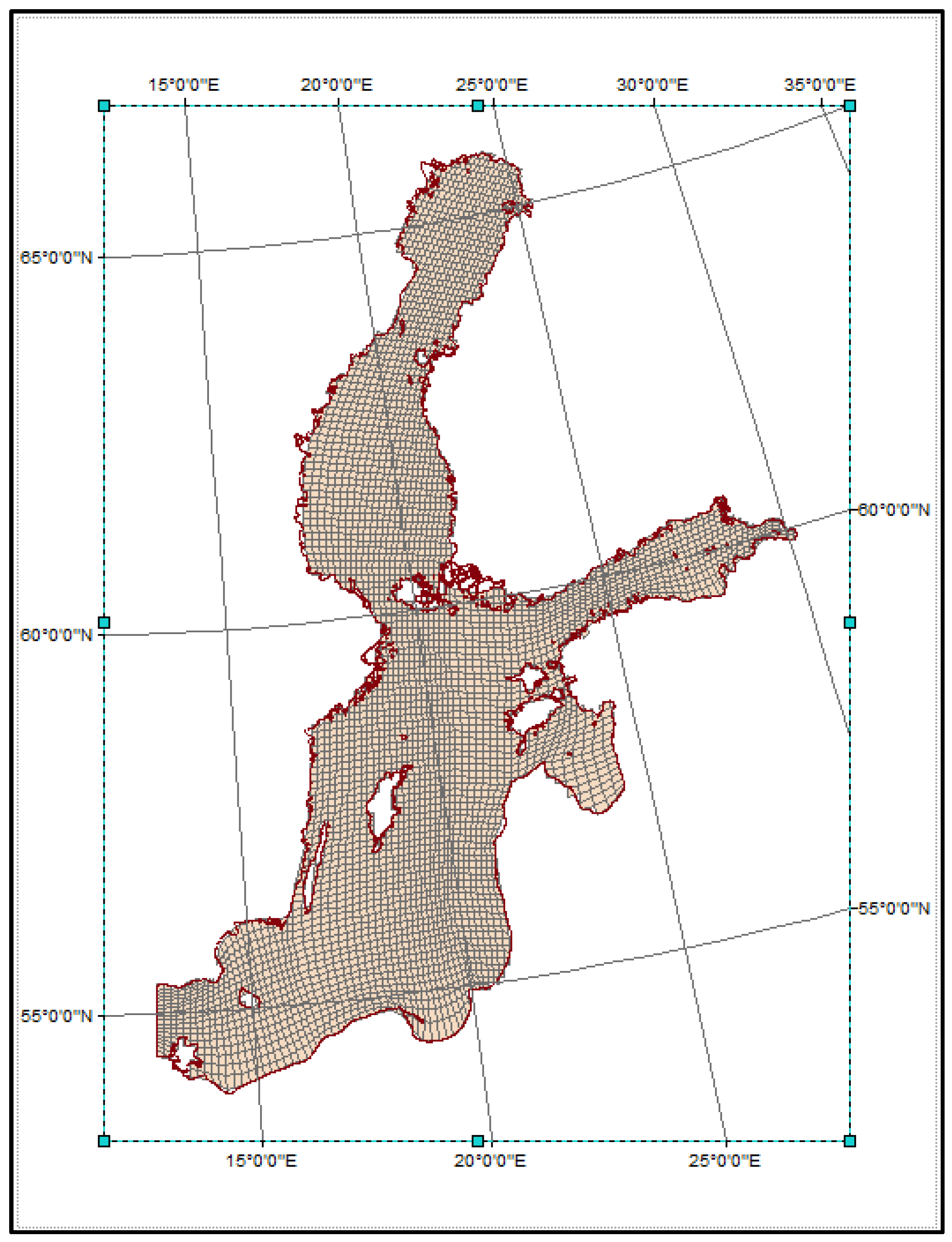 Figure 4. The grid dimensions are 195 × 200, with an approximate cell size of 4.8 km. The final bathymetry described in the previous section was used to interpolate the depths for each grid cell in the study domain. Since depths less than 100 m cover almost 80% of the Baltic Sea, the vertical layers were designed to have a finer resolution within this depth. The total number of vertical layers used in the current study was 47, with thicknesses varying from 1.5 m to 12 m.