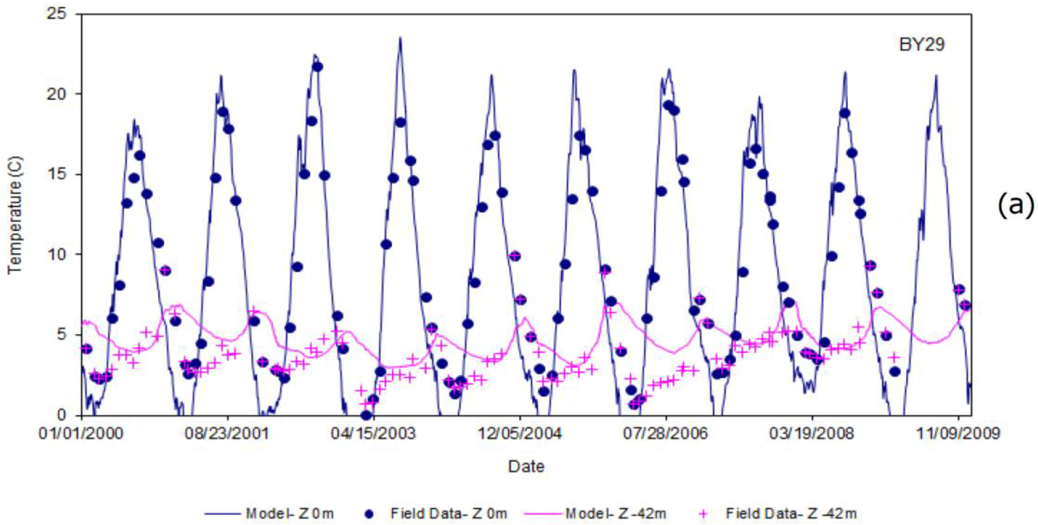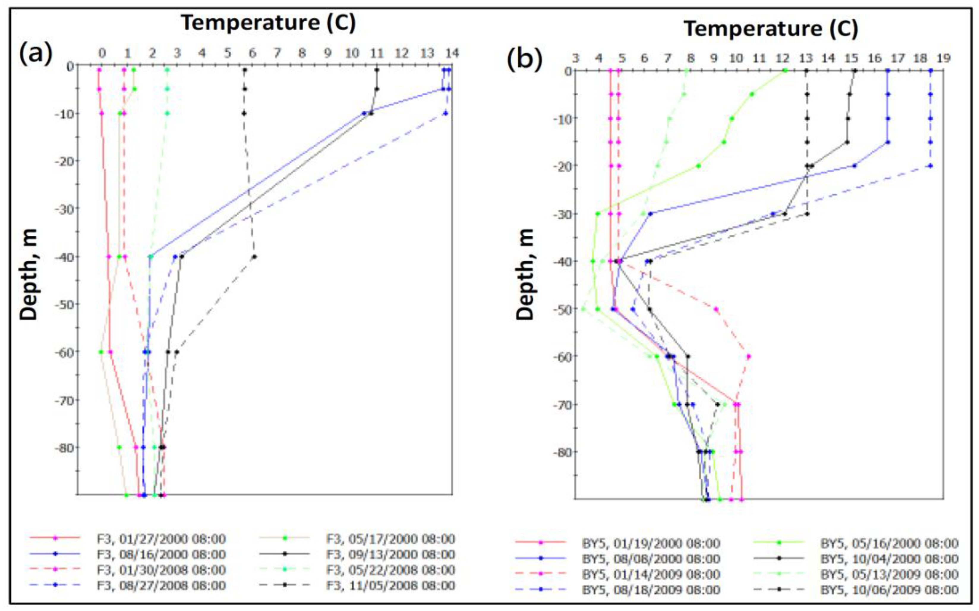 Figure 19 shows the measured vertical temperature profiles at F3, and BY5 for the years 2000, 2008, and 2009. Note that the data were rather limited and thus the lines are only illustrative and do not necessarily show the correct trends. The good agreement with the simulated summary results listed in