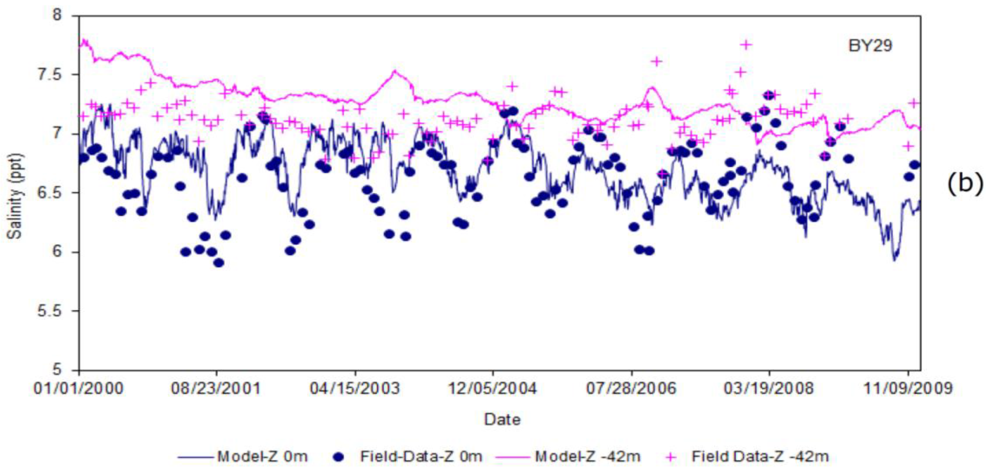 The model prediction of three-layered salinity stratification in all basins of the Baltic Sea is in general agreement with previous studies [