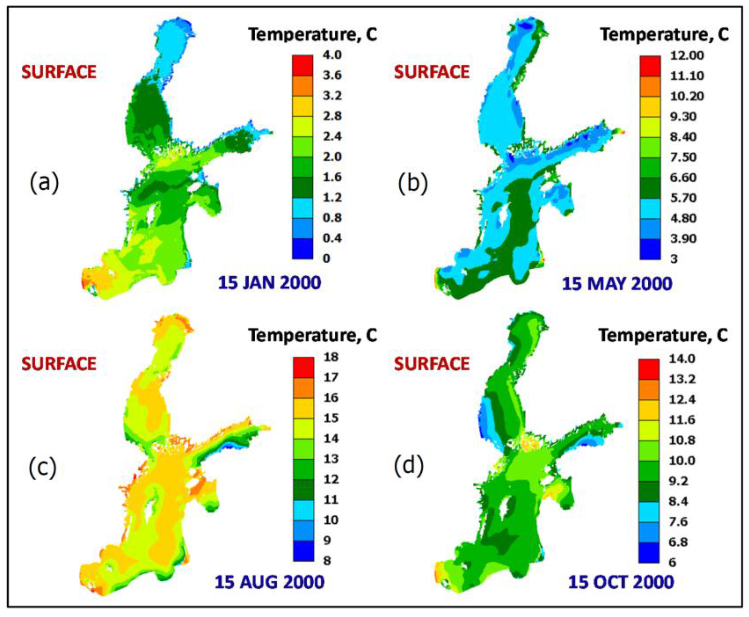 The detailed investigation of thermal stratification for a 10-year period (i.e., 2000–2009) revealed some new features. The current study revealed a multilayered structure that contains several thermocline and dicothermal layers. The statistical analysis of all simulation results made it possible to derive the mean thermal stratification properties, expressed as mean temperatures and the normalized layer thicknesses (