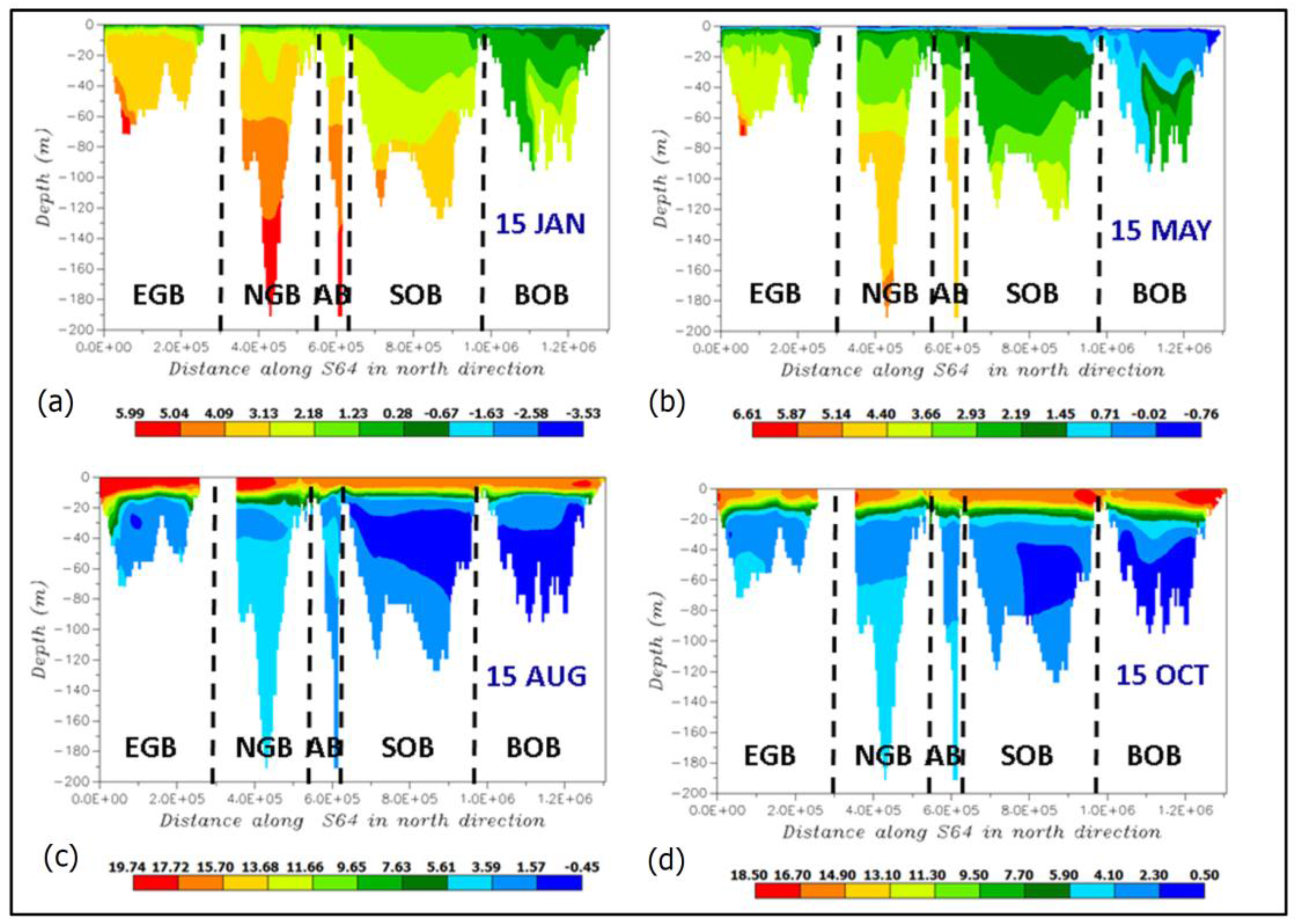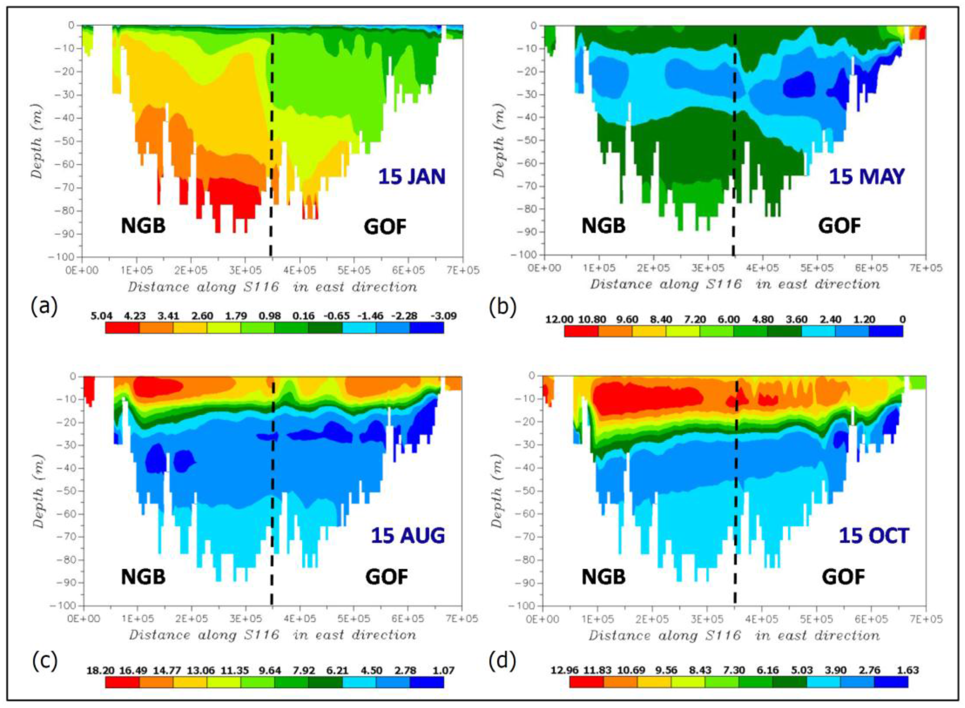 3/s), significantly affects the stratification in the Gulf. The zero-salinity water from the river creates a permanent plume that propagates westwards to a distance of 50–150 km. The plume salinity varies from 0% to 5% and extends to a depth of about 15 m. The maximum extension occurs during early spring periods. The seasonal cross section plots are shown in