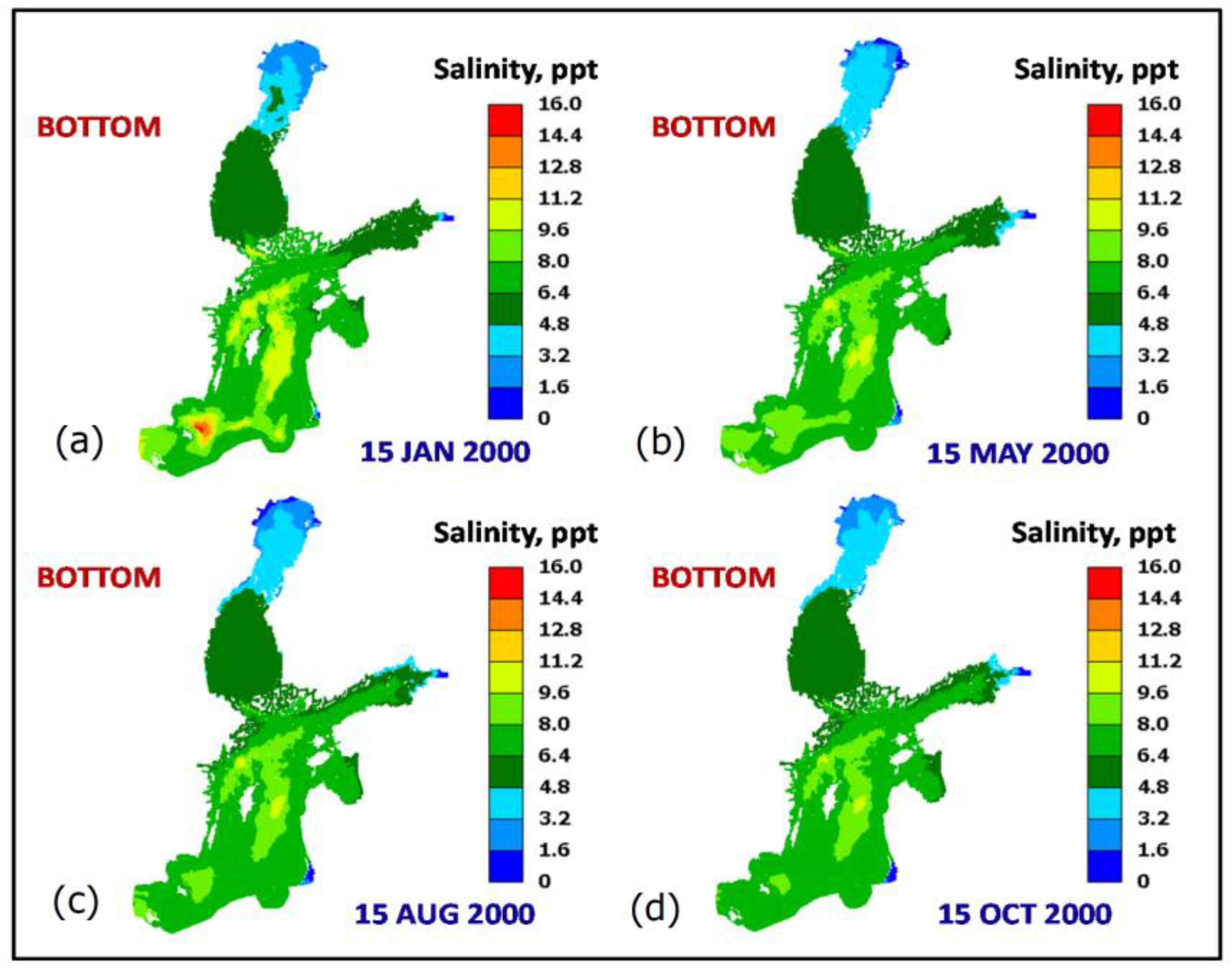 11]. The surface salinity varies in the north with a mean value of 3 ppt (parts per thousand) to 8 ppt to the south, i.e., the Arkona Basin. The corresponding mean value at the lower layer is in the range of 4–12.5 ppt. However, the salinities are considerably higher in the open sea. The mean values in the Kattegatt (the region in which the Baltic Sea drains through the Danish strait) are 22 ppt and 31 ppt, respectively (same references). Suominen et al. [
