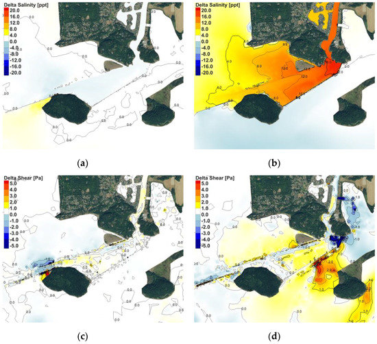 Time averaged salinity distribution (20 days) for (a) baseline conditions and (b) Jetty Repair Scenario, SCN-1.
