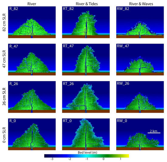 Simulations performed with a finer sediment of 100 μm indicate a higher capacity of deltaic coasts to dynamically respond to SLR (Table 1, RH_82_FI). The suspended sediment fraction increases for finer-grained sediment allowing for more efficient delta aggradation to dynamically respond to SLR. This, in turn, indicates an increased resilience to coastal flooding due to SLR for finer-grained suspension-dominated delta systems compared to coarser-grained bedload-dominated deltas. Additional sensitivity tests in which we changed the sediment transport calculation from Van Rijn [22,23] to the Engelund–Hansen formulation [24] show changes in the depth of channels and the elevation of bars but the overall delta morphology and the ability to dynamically respond to SLR are similar (Table 1, RH_82_EH).