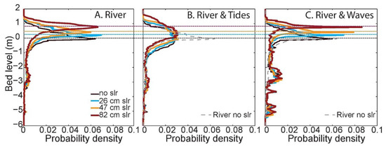 In addition to the flooding of land due to SLR, the modelled deltas show a shift in the bed level distribution, affecting coastal habitat distribution (Figure 2). Particularly relevant are marshes situated on coastal platforms in the intertidal range for which minor changes in topography and hydrodynamics can lead to vegetation disturbance and thus cause rapid marsh degradation [34]. The general deepening of the delta relative to mean sea level and the gentler slope of the coastal platform in the modelled deltas for higher SLR along with a change in flow velocity range (Figure 3) may well have significant implications for coastal marsh survival. Our simulations indicate an increase of 17% (Figure 3B) and 23% (Figure 3C) of the coastal platform submerging to subtidal levels and below the wave base, respectively, representing an important threshold below which the coastal platform cannot sustain vegetation growth [11,35]. Essentially, SLR causes parts of the intertidal area to be replaced by subtidal area, limiting the diversity of coastal habitats and suitability for many coastal species.