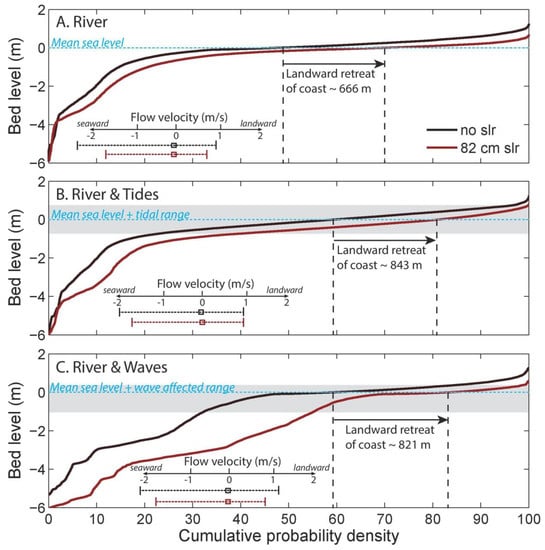 Integrated shoreline profiles relative to the mean sea level for deltas with SLRs of 0 cm (black) and 82 cm (red). (A) River-dominated delta coasts; (B) River- and tidally-influenced delta coasts. The simulated tidal range of 1.5 m is indicated in grey; (C) River- and wave-influenced delta coasts. The simulated wave range is indicated in grey with an upper range of 0.5 m, corresponding to the simulated significant wave height. The lower bound corresponds to the wave base, which is calculated as 0.5 times the wave length (in turn, calculated as wave velocity (0.5 m/s) times wave period (5 s)). The transition from subaqueous to subaerial delta is indicated by the horizontal blue dash line (see also Table 1 for descriptive statistics). The difference between the vertical black dash lines corresponds to the average shoreline retreat between 0 cm and 82 cm of SLR. Flow velocity statistics show a decreased velocity range for deltas with 82 cm SLR compared to no SLR.