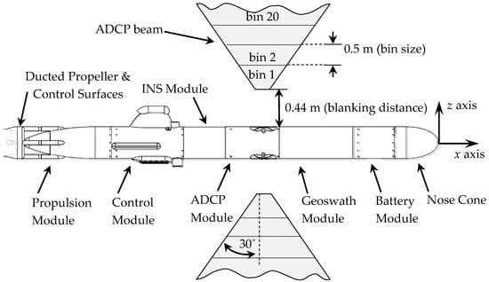The ADCP module of the AUV included two 1200 kHz Teledyne RD Instruments ADCPs/DVLs arranged in upward- and downward-looking configurations. While the upward-looking transducers were configured so that the instrument only collected water column velocity data relative to the AUV, the downward-looking set had a dual purpose: (i) water column data collection (i.e., ADCP mode), and (ii) estimation of the velocity of the vehicle relative to the ground as an input into the navigation solution of the vehicle (i.e., DVL mode). At every sampling time-step, the instrument’s mode of operation switched between the ADCP and DVL. The ADCPs were programmed to profile approximately 10 m of water column in 0.5 m range bins so that the three directional water velocity components relative to the AUV in the body-fixed coordinate system are measured in each bin. During post processing, water velocity components relative to the AUV were converted to the Earth-relative velocities by using the vehicle’s Earth-referenced velocity measurements from the DVL-aided INS. However, the water velocity measurements remained in the body-fixed coordinate system.